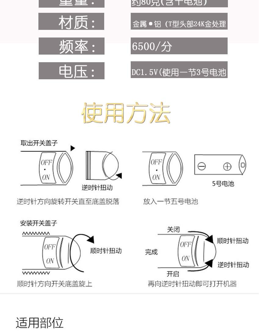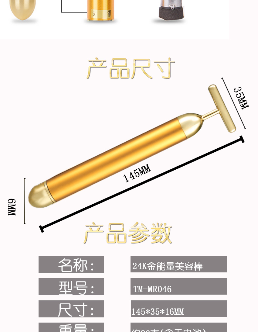 規(guī)格 140*16mm 功能 定時(shí) 適用對(duì)象 12周歲以上 上市時(shí)間 2013年 檔位 1 貨號(hào) TM-MR-046 顏色 金黃色 重量 約80g 適用場(chǎng)合 家庭,美容院,提拉緊致黃金美容棒-046提拉緊致黃金美容棒-046," />