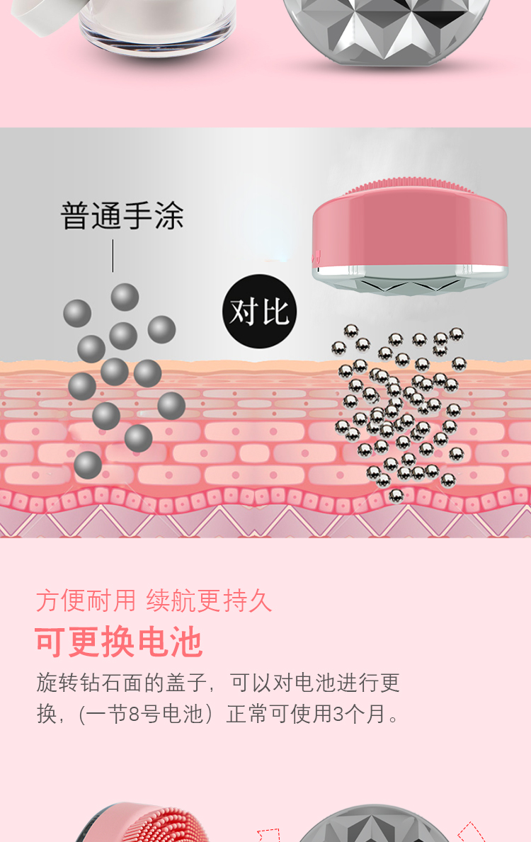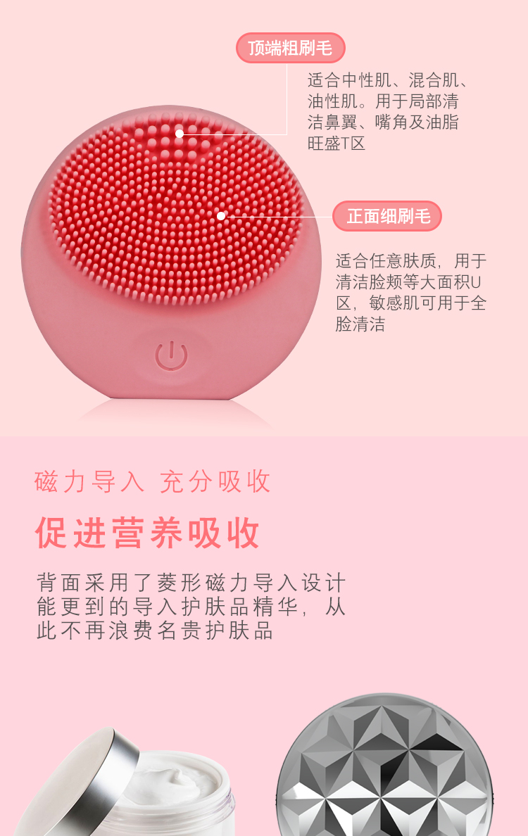 安心親膚的食品級硅膠材料,潔凈不傷臉 每天溫和深層清潔毛孔和污垢 有效清除毛孔內(nèi)99%的污垢,角質(zhì)?油垢 背面離子導(dǎo)入,促進(jìn)下一步化妝品的吸引 促進(jìn)血液循環(huán),令肌膚煥然一新 電池充電,隨用隨裝 ,多功能旅行裝磁力導(dǎo)入潔面儀多功能旅行裝磁力導(dǎo)入潔面儀," />